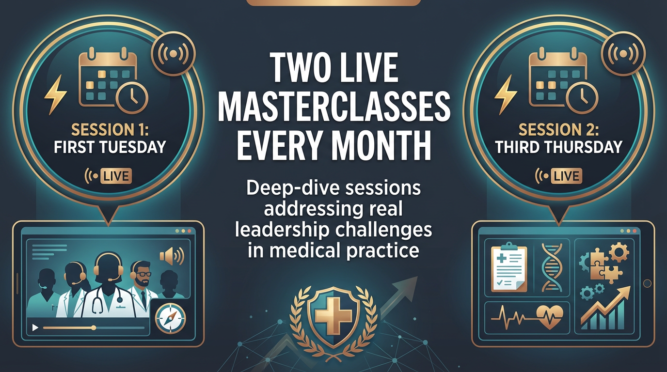 Deep-dive sessions addressing real leadership challenges in medical practice